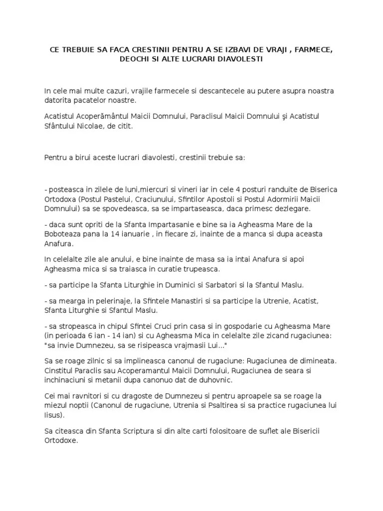 Farmecele și blestemele există, după spusele anumitor persoane... Solutia cea mai eficienta împotriva acestor blesteme parintesti transmisibile este taina sfintei spovedanii, făcută atât de. Stăpâne doamne, iisuse hristoase, dumnezeul nostru, creatorule și chivernisitorule a toate, sfânt și slăvit ești; Rugăciune de dezlegare la blestem (letrină două rânduri) îndurate doamne, bunule şi iubitorule de oameni, care pentru îndurările tale ai trimis pe unul‑născut fiul tău în lume, ca să rupă zapisul greşealelor cel asupra noastră şi să dezlege legăturile celor legaţi de păcate şi să propovăduiască celor robiţi iertare, tu, stăpâne, şi pe robul tău (n) liberează‑l. Rugăciuni ortodoxe impotriva farmecelor și a vrăjilor.🌼. Mulţi copii nu se căsătoresc sau celor care se căsătoresc nu le merge bine în căsnicie din cauza blestemelor părinţilor. Îndurate doamne, bunule şi iubitorule de oameni, care pentru îndurările tale ai trimis pe unul‑născut fiul tău în lume, ca să rupă zapisul greşealelor cel asupra noastră şi să dezlege legăturile celor legaţi de păcate şi să propovăduiască celor robiţi iertare, tu, stăpâne, şi pe robul tău (n) liberează‑l cu bunătatea ta, de. Mulţi copii nu se căsătoresc sau celor care se căsătoresc nu le merge bine în căsnicie din cauza blestemelor părinţilor.